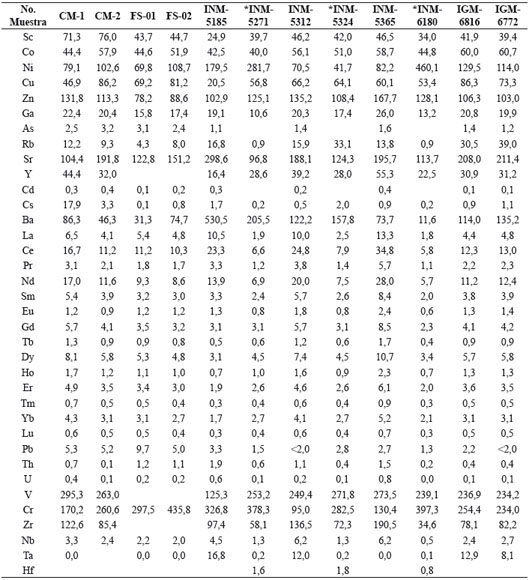 En la TABLA 3 se presentan los resultados de las concentraciones de elementos traza y tierras raras (REE) de las muestras analizadas de la unidad Basaltos de San Pablo. Las concentraciones de elementos compatibles como Ni están entre 70 y 179 ppm, los valores de V entre 228 y 295 ppm, con disminución de la concentración de V con el aumento de SiO2 y la muestra INM-5185 tiene un valor menor de V de 125,3 ppm. Los valores de Cr en los Basaltos de San Pablo varían entre 170 y 436 ppm, excepto la muestra FS-01 que tiene un valor de Cr <100 ppm.