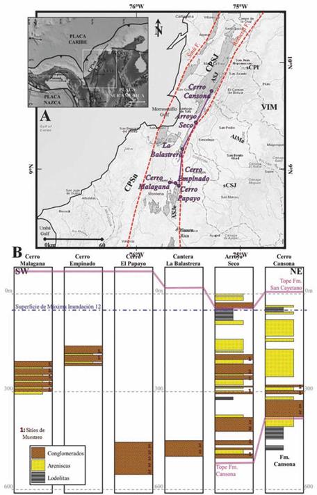 El CPSJ se encuentra separado del Cinturón Plegado del Sinú (CPSn) al Nor-Oeste por el Lineamiento del Sinú, y del Valle Inferior del Magdalena (VIM) al Sur-Oeste por el sistema de fallas de Romeral. La cuenca del VIM se subdivide en la sub-cuenca de Plato al Norte y la sub-cuenca de San Jorge al Sur (Barrero et al., 2007), siendo separadas por el Alto de Magangué (AlMa) en la parte central (altos de El Difícil y Cicuco, y la plataforma de Chimichagua al Sur-este) (FIGURA 1A). El basamento del VIM es considerado una corteza continental integrada por rocas ígneas intrusivas y extrusivas, y rocas metamórficas (INGEOMINAS, 1997). Este basamento presenta una importante similitud con el basamento de la Cordillera Central (Terreno Cajamarca-Valdivia, sensuCediel et al, 2003) y el Macizo de Santa Marta (sub-placa de Maracaibo, sensuCediel et al, 2003) (Vinasco et al, 2006; Cardona et al, 2010; Montes et al, 2010; Spikings et al., 2015). Otras litologías ígneas de edad Cretácico Tardío han sido igualmente reconocidas recientemente en el basamento del VIM (Silva-Arias et al, 2016); mientras que solo presenta un registro de rocas sedimentarias desde el Eoceno (Cerón et al, 2007; Mantilla-Pimiento, 2007), lo que sugiere que el VIM se encontraba emergido para el Cretácico Tardío y Paleógeno Temprano. Por otra parte, el basamento del CPSJ se compone de litologías básicas y ultrabásicas relacionadas con la Gran Provincia Ígnea del Caribe, que están cubiertas por una secuencia sedimentaria que inicia con rocas de ambiente marino (calizas y margas) pertenecientes a la Formación Cansona de edad Cretácico Superior (Duque-Caro, 1973; GEOTEC, 1997; 2003; Guzmán et al, 2004; Guzmán, 2007). La Formación San Cayetano (se incluye su formación equivalente Arroyo Seco) es considerada como de edad Paleógeno Inferior (Duque-Caro et al, 1996; GEOTEC, 1997; Guzmán, 2007) y se encuentra de manera discordante sobre la Formación Cansona, su contacto superior también es discordante, entrando en contacto bien con la suprayacente Formación Maco (Eoceno Medio) en el Arroyo Maco (Paraconforme?), con la Formación Toluviejo (Eoceno Superior) en el Sector de Arroyo Seco, o con la Formación Ciénaga de Oro (Oligoceno) en los sectores de Ciénaga de Oro y Tuchín. En la Formación San Cayetano se documentan dos grandes segmentos: hacia la parte inferior se observan capas medias y gruesas de conglomerados polimícticos matriz-soportados con clastos subredondeados tamaño bloque, con bases erosivas e intercaladas con grandes cuerpos masivos de conglomerados matriz-soportados de gradación inversa. Estos conglomerados varían texturalmente a areniscas de grano medio a grueso y areniscas conglomeráticas ocasionalmente con estratificación cruzada planar y en artesa con imbricación de clastos. Esta transición del segmento basal conglomerático a intercalaciones de areniscas y lodolitas, culmina con un nivel superior relativamente espeso de capas gruesas de lodolitas, lodolitas calcáreas gris oscuras y capas delgadas de litoarenitas con ocasional cemento calcáreo, laminación plano-paralela, ondulosa y escasas ondulitas.