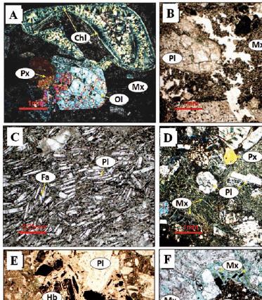 Los clastos ígneos extrusivos de naturaleza máfica identificados corresponden a basaltos amigdaloides, comunes hacia el Sur en el sector de Cerro El Papayo (láminas 5000165-1 y 5000175-1) y Cerro Empinado (láminas 5000156-2 y 5000156-1); mientras que disminuyen hacia el Norte en los sectores de la Cantera La Balastrera y en el Cerro Cansona (láminas 5000145 1 y 5000188-1). Generalmente los basaltos descritos se caracterizan por una textura porfídica, localmente con textura glomeroporfídica; están compuestos por fenocristales de: plagioclasa (25-36%) con inclusiones de minerales opacos, olivinos (8%) y piroxenos (67%), ambos parcialmente cloritizados; dentro de una matriz (18-30%) de microcristales de: feldespato, vidrio, óxidos de hierro y clorita; además poseen amígdalas de agregados fibroso-radiales de clorita y zeolita (FIGURA 2A). Algunos basaltos con textura glomeroporfídica localizada presentan alteración de sus fenocristales de plagioclasa (38%) y feldespato potásico (5%) a sericita y caolinita, respectivamente (lámina 5000188 1); además la matriz predominantemente vítrea (30%) presenta una textura fluidal. En el Cerro El Papayo algunos clastos presentan una tonalidad verde claro generada posiblemente por alteración sericítica y localmente propilítica, además de estructuras auto-brechificadas que muestra tonalidades ocres a marrón-rojizo. El análisis petrográfico de estos clastos (lámina 5000175-1) son clasificados como basaltos de textura porfídica formada por fenocristales aglomerados de plagioclasa (53%) alterada a sericita (algunas zonadas y con aspecto esquelético), con una matriz que contiene vidrio (25%), clorita (1%), microcristales de plagioclasa (15%) y feldespato alcalino (5%); ocasionalmente presenta fenocristales de piroxenos (1%) fuertemente alterados a clorita y con bordes de oxidación (FIGURA 2B).