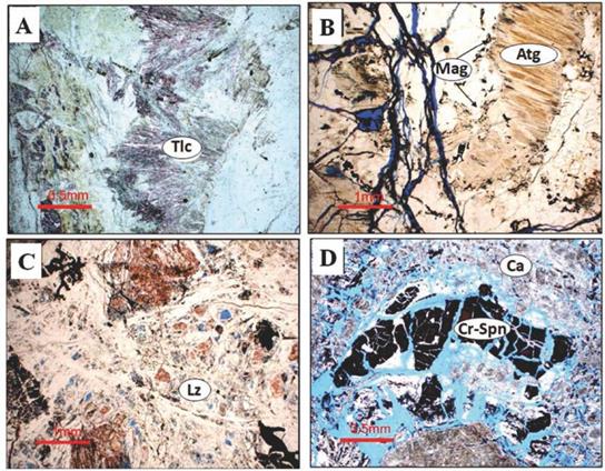 En la zona Centro-Sur aparecen clastos de peridotitas serpentinizadas (Cantera La Balastrera: 5%, y Cerro El Papayo: 8%) (8-10 cm de diámetro) de color negro con pátinas verdes a verde claro en su totalidad dependiendo del grado de alteración de las rocas ultramáficas (tipo serpentina-talco-clorita), además de una textura enrejada en la superficie de los clastos. Petrograficamente se describió uno de los clastos del sector de La Balastrera como serpentinita (lámina 5000088-1-3-4), la cual posee minerales derivados de la alteración de rocas ultramáficas, como: lizardita con textura en mallas asociada con olivino, magnetita, clorita y talco (FIGURA 3A); serpentina formando pseudomorfos (bastitas) reemplazando orto-piroxenos y clino-piroxenos. En el sector del Cerro El Papayo se describieron petrográficamente tres (3) muestras de serpentinitas (láminas 5000167-3, 5000169-1 y 5000174-2) que están compuestas de minerales del grupo de la serpentina como lizardita y antigorita que están alterando fuertemente los piroxenos y olivinos, que aparecen como relictos generando una textura pseudomórfica (FIGURA 3B y 3C). Como accesorios se encuentran magnetita y cromo-espinela en cristales fracturados; y ocasionalmente se identifican procesos de carbonatación por la presencia de calcita en agregados cristalinos (FIGURA 3D).