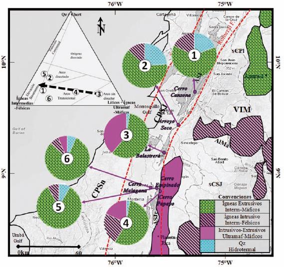De acuerdo con la cuantificación y descripción macroscópica de clastos, y los análisis petrográficos microscópicos en los seis (6) afloramientos de conglomerados basales de la Formación San Cayetano; el área de estudio se puede dividir en dos (2) sectores: Norte (Cerro Cansona y Arroyo Seco) y Sur (Cantera La Balastrera y, Cerros El Papayo, Empinado y Malagana). En el sector Norte abundan los clastos ígneos extrusivos de afinidad intermedia y máfica (basaltos con vacuolas, andesita y dacita), y algunos clastos ígneos intrusivos, donde predominan los de afinidad intermedia (dioritas y granodioritas) y solo de afinidad félsica (granitoides y pegmatitas) en Arroyo Seco. En el sector Sur predominan los clastos ígneos extrusivos de afinidad máfica e intermedia (basaltos con vacuolas, andesita-dacita y algunos basaltos sin vacuolas), además de clastos ígneos intrusivos de afinidad ultramáfica y máfica (peridotitas serpentinizadas y gabros) y escasos de afinidad félsica (granitoides) solo en los cerros Empinado y Malagana (FIGURA 4). La separación entre los dos sectores corresponde con el área de Sincelejo (entre Arroyo Seco y la Cantera La Balastrera) y está marcada por la presencia hacia el Sur de clastos de afinidad ultramáfica y máfica como serpentinitas, gabros y basaltos sin vacuolas, los cuales no son reportados en las mismas secuencias conglomeráticas hacia el Norte. La presencia de clastos de basalto con vacuolas evidencian la inmiscibilidad o separación de una fase vapor, por procesos de despresurización del magma silicatado (Best y Christiansen, 2001); este tipo de basalto con vacuolas también ha sido reportado en el basamento del pozo Apure-1 en la Subcuenca de Plato (sCPl), en donde las anomalías magnéticas identificadas en la subcuenca corresponden con basaltos y andesitas (pozos Apure-1, Apure-2 y Remolino-1) y cuyo análisis geoquímico correlaciona dicha litología con un ambiente de arco magmático en un corteza continental adelgazada (Silva-Arias et al, 2016).