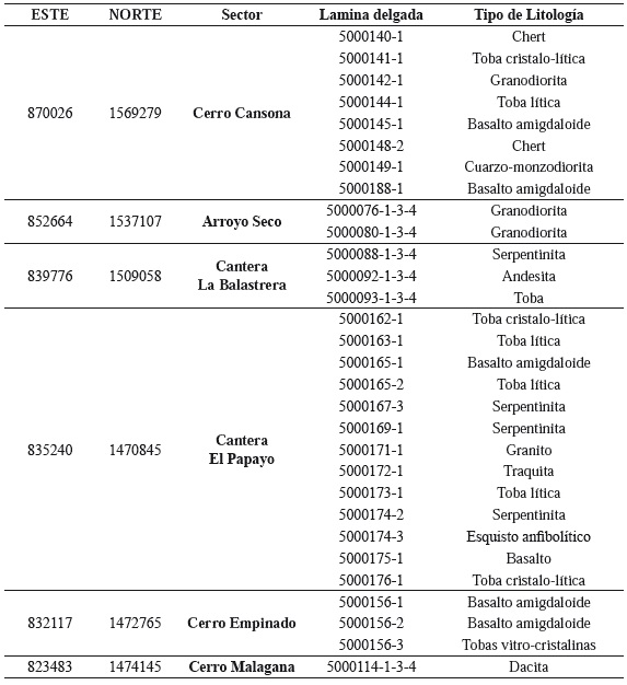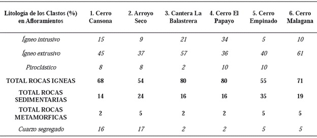En la zona Norte (Cerro Cansona y Arroyo Seco) aparecen clastos de cuarzo cristalino lechoso (de 2-3 cm de diámetro), en una proporción de 16 a 18% (respectivamente), que disminuye al 2% de los clastos identificados en la zona Centro-Sur (Cantera La Balastrera y Cerro El Papayo), y aumenta su presencia al 5% en los clastos identificados en la zona Sur (Cerro Empinado y Cerro Malagana) (TABLA 2). En el sector del Cerro Malagana, algunos de los clastos de cuarzo contienen fragmentos de rocas metamórficos en su interior; además de la presencia de cuarzo y moscovita en venas (0,5-1,0 cm de espesor) producto de la segregación metamórfica, en esquistos cuarzo-micáceos.
