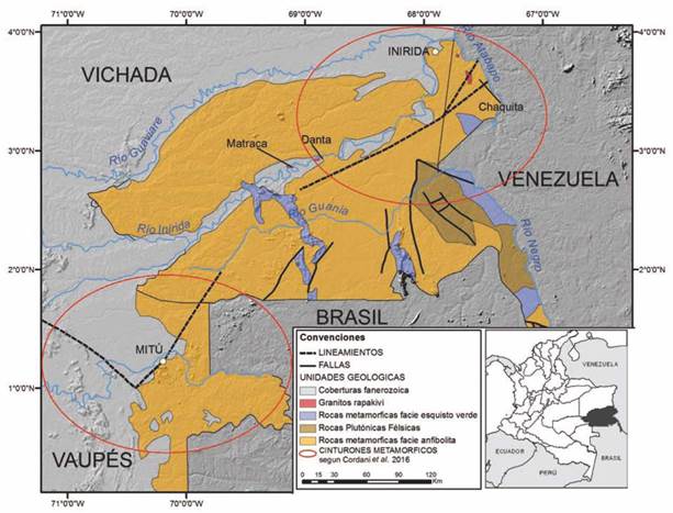 Recientemente, Cordani et al. (2016) avanzaron aún más y con base en la recopilación de estudios anteriores (Barrios et al., 1985; Gaudette y Olszewski, 1985; Priem et al., 1982) y nuevos datos geocronológicos proponen hacia el nororiente del Departamento de Guainía diferenciar un Cinturón Atabapo metamórfico (FIGURA 1) formado por una serie de pulsos orogénicos durante el Paleoproterozoico (Estateriano) hace 1800 1740 Ma (como parte del Complejo Mitú) que fue intruído por rocas graníticas hace unos 1500 Ma. La integración del análisis de 27 muestras granitoides tomadas por Priem et al. (1982), Pinheiro et al. (1976) y Santos et al. (2003) entre Mitú, en Colombia, y Iauaretê, en Brasil, y de muestras otorgadas por el Servicio Geológico Colombiano llevaron a Cordani et al. (2016) a diferenciar otro cinturón más joven llamado Cinturón de Vaupés de 1580-1520 Ma al suroccidente (FIGURA 1), en donde interpretan rocas con edades de ~1750 Ma como ventanas del basamento, mientras las rocas graníticas más jóvenes no deformadas representarían magmatismo granítico post-tectónico.