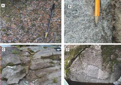 La roca de la estación GU-404-130 (FIGURA 2) presenta grano medio equigranular, es leucocrática de composición granodiorítica con cuarzo, plagioclasa, feldespato potásico, biotita, epidota y esfena. Microscópicamente presenta una orientación de los cristales y marca una radioactividad de 0,34 μSv/h. Una cuarzo-monzodiorita y al lado una granodiorita en cercanías a la Comunidad Indígena de Barranquilla (GU-403-135) dan pistas interesantes, aunque desafortunadamente la cobertura vegetal y de suelos no permitió trazar su correlación en campo. La cuarzo-monzodiorita con cristales de alrededor 0,3 mm de cuarzo 7%, plagioclasa 30%, feldespato potásico 16%, contiene parches particularmente grandes de biotita 18% y de hornblenda ~15%, esfena 9% (>2mm) y circones irregularmente distribuidos (FIGURA 3C-3F); una parte de los minerales opacos que se deja atraer por un imán son magnetitas. Otra cuarzo-monzodiorita con algo más de plagioclasa que la anteriormente descrita fue observada en GU-404-133 donde se presenta con alta meteorización puesto que la biotita presenta cloritización y también se encuentra epidota; algunas venas de epidota han generado deformación de micas (FIGURA 3G-3H). Geoquímicamente (TABLA 1) se encuentran en el rango normal de monzodioritas con bajo Si; contiene más Fe, Al, Ca y P y menos Mg comparado con unas 20 monzodioritas con SiO2 alrededor de 54% (de una base de datos de 557 monzodioritas extraída de EarthChem.org); también las concentraciones de Ba, Sr, Ce, Ti y Zr son relativamente altas, los tres últimos en concordancia con abundantes apatitos, circones y esfenas observadas. Posiblemente los apatitos contienen algo de Th, indicado por una radioactividad levemente elevada en el testigo de la sección delgada (~0,35 μSv/h), aunque ni Th ni U fueron detectados por XRF. En los diagramas de Frost et al. (2001) estas cuarzo-monzodioritas ocupan el campo férrico, cálcico a cálcico-alcalino y meta a peraluminoso y sus contenidos de Mg, Ca y Al (factor R2 de Batchelor y Bowden, 1985) indican ambientes geotectónicos de colisión pre-placa (FIGURA 9). El significado de la gran similitud geoquímica de los contenidos de elementos analizados de estas cuarzo-monzodioritas de tendencia máfica con el promedio de la Corteza Inferior (Taylor y McLennan, 1985) es objeto de estudios en curso.