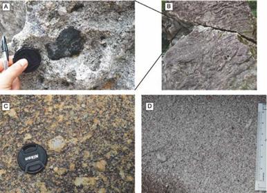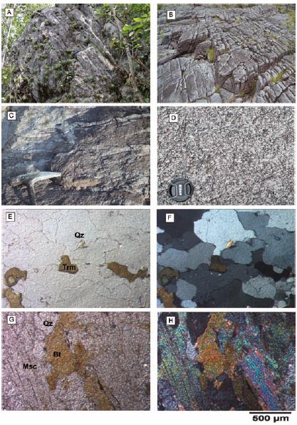 A lo largo del Río Cuiarí y la parte alta de Caño Naquén los afloramientos de rocas metamórficas del Complejo Mitú son muy esporádicos, tienen una expresión morfológica llana y tienden a ser inundadas por el río en épocas de invierno. Entre las comunidades indígenas de Barranquilla y Miraflores (FIGURA 2) de 80 km de distancia se encuentra solo uno de estos afloramientos en la estación GU-404-131 (FIGURA 2), cuyas texturas de foliación y/o bandeamiento son notorias y están definidas por las siguientes características: bandeamiento composicional de cuarzo, feldespato potásico y plagioclasa vs biotita y alineamiento de cristales. Aquí corresponde a un ortogneis compuesto de cuarzo, feldespato potásico, plagioclasa, biotita, y esfena. La textura es bandeada en dirección N40W, se encuentran acumulaciones de biotita cloritizada (FIGURA 8A-8B) y es cortada por diques pegmatíticos cuarzo-feldespáticos de hasta 5 cm de espesor. La meteorización de estas zonas con mayor contenido de minerales máficos deja formas acarcavadas, a diferencia de los granitos cercanos con meteorización esferoidal. La radioactividad de la roca metamórfica marca 0,40 μSv/h, de las acumulaciones de biotita 0,29 μSv/h y de las pegmatitas 0,44 μSv/h.