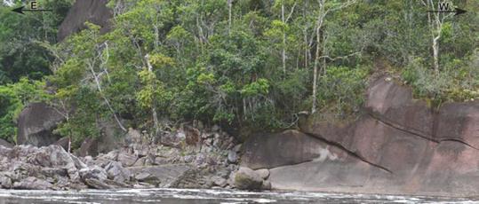 En el mismo Raudal Yuruparí se puede observar su contacto intrusivo con las cuarcitas del miembro superior del Grupo Tunuí donde generó turmalinas e incorporó xenolitos de cuarcita dentro del granito (FIGURA 12). Remanentes de actividad minera aurífera a lo largo del contacto hacen suponer una removilización y mayor concentración de oro por fluidos asociados al intrusivo.