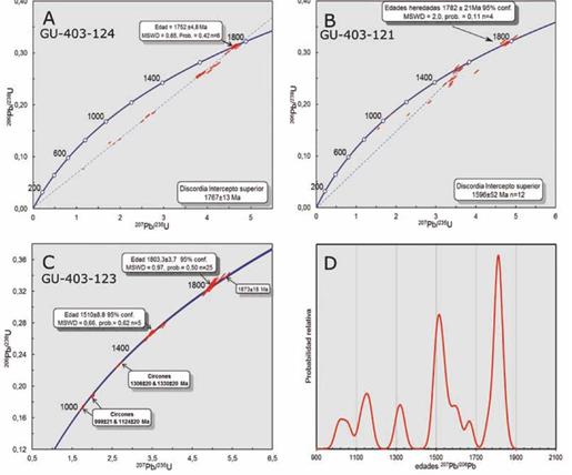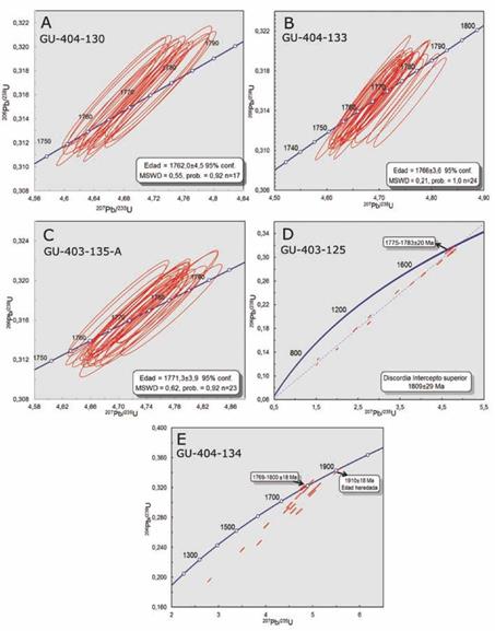 Los circones extraídos de una granodiorita del Complejo Mitú (GU-404-130) de forma subhedral a euhedral, levemente redondeados, con un diámetro entre 200-300 Lm permitieron obtener en 17 granos datos isotópicos de las cuales se calculó una edad concordante de 1762±4,5 Ma (FIGURA 13A) interpretadas como edad de cristalización. De 24 y 23 granos de circones euhedrales con diámetro entre 100-200 Lm de las cuarzo-monzodioritas GU-404-133 y GU-403-135-A se calcularon edades concordantes de cristalización de 1766±3,6 Ma y 1771±3,9 Ma (FIGURA 13B, 13C). Circones euhedrales, prismáticos, con un diámetro entre 50-100 Lm del monzogranito de la estación GU-403-125 dieron una edad discordante con intercepto superior en 1809±29 Ma, 2 granos cercanos a la concordia indican edades de 1775 y 1783Ma (FIGURA 13D), que se encuentran dentro del rango de error y pueden corresponder a la cristalización.
