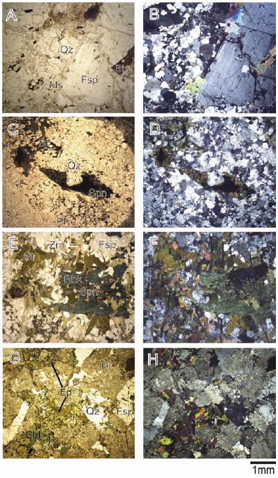 Las rocas ígneas en general exhiben una textura fanerítica y porfirítica, también se pueden observar texturas especiales como mirmequítica, antipertítica, pertítica y poiquilítica, sus cristales pueden alcanzar tamaños mayores a 1 cm, son holocristalinas, en su mayoría inequigranulares y melanocráticas, cuyo tamaño de los cristales varía de medio a grueso (>1 mm). Consisten principalmente de cuarzo, plagioclasas (albita-oligoclasa) y feldespatos potásicos (microclina-ortoclasa). Los minerales accesorios generalmente son biotita, muscovita, apatito, esfena, epidota y circón (FIGURA 3). Excepcionalmente, en la muestra GU-403-135-A se identificó hornblenda (FIGURA 3E, 3F). En todas las rocas ígneas el cuarzo se encuentra en cristales generalmente anhedrales, sin signos de meteorización, aunque se presentan cristales fracturados en los cuales parecen haber precipitado fluidos circulantes (hidro-) óxidos de hierro. Granos de cuarzo de menor tamaño forman inclusiones o intercrecimiento en cristales de plagioclasa y/o feldespato potásico, constituyendo textura poiquilítica y mirmequítica respectivamente. El feldespato potásico (únicamente encontrado como microclina) forma cristales euhedrales y subhedrales, con macla en enrejado, con extinción recta y en varios casos fuertemente alterados a caolín. Sus fenocristales con textura poiquilítica presentan generalmente inclusiones de cuarzo, plagioclasa y biotita; a veces se observa también desmezcla pertítica de plagioclasa e intercrecimiento mirmequítico con cuarzo. Las plagioclasas (albita-oligoclasa) suelen formar cristales anhedrales y subhedrales, con extinción según macla entre 5° y 25° (método de Michel-Levy), con maclado de la albita, periclina y Carlsbad. A veces la desmezcla de microclina conforma una textura antipertítica pronunciada. En muchos casos las plagioclasas están fuertemente sericitizados y epidotizados, hasta un casi total reemplazamiento por muscovita. La biotita presenta pleocroísmo marrón, en cristales subhedrales, generalmente se encuentra asociada a los halos de oxidación que presentan los opacos y suele estar alterada parcial o totalmente a clorita. Las hornblendas se distinguen por su pleocroísmo fuerte verdoso en cristales subhedrales a anhedrales (FIGURA 3E-3F).