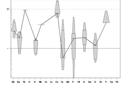 La utilidad de los datos geoquímicos obtenidos por XRF se limita principalmente a los elementos mayores y algunos traza (TABLA 1), pero debido a los límites de detección no suficientes elementos geotectónicos tan importantes como Nb, Y, Th, La fueron detectados con suficiente precisión; si Y tiene en todas las mediciones un valor exacto de 100 ppm y solamente para las rocas de la Suite Intrusiva Tiquié con 200 ppm no se puede sobreestimar estos valores. Sin embargo, dejan ver ciertas tendencias, como un enriquecimiento parcial en relación al promedio de la Corteza Superior (FIGURA 4), que se van a discriminar en los subcapítulos de las diferentes rocas y unidades. Posiblemente los elementos Na y K son subvalorados como lo sugiere la comparación del diagrama Streckeisen (FIGURA 5). En la mayoría de los elementos mayores (menos Na y K que muestran mayor dispersión) se confirma una correlación negativa con SiO2 (FIGURA 6), igualmente como para Ba y Sr (no mostrados aquí). A la par se puede observar una correlación negativa de Ti con Si, Rb y de A/CNK, y una correlación positiva con Al, Mg, Fe, P, Ba, Sr y Zr (FIGURA 7).