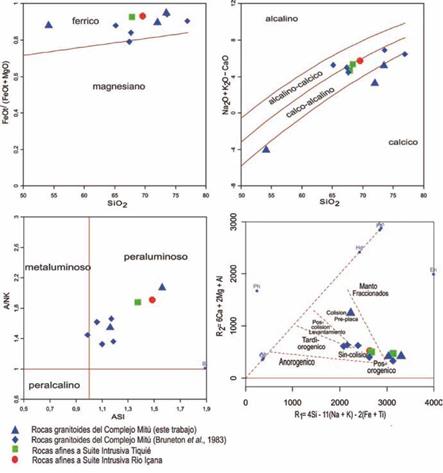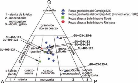 Los granitoides del Complejo Mitú analizados en el sur del Departamento de Guainía son petrográficamente en su mayoría monzogranitos, pero con variaciones más máficas hacia granodioritas y cuarzo-monzodioritas (FIGURA 5). Geoquímicamente son granitoides férricos, calcoalcalinos-cálcicos, peraluminosos a metaluminosos y con características de granitos sin-colisionales a pos-orogénicos (FIGURA 9). En las estaciones GU-404-132 y GU-404-134 sobre el camino que comunica al Río Cuiarí con Caño Naquén, aflora un monzogranito de grano grueso inequigranular (FIGURA 8C) compuesto de cuarzo 42%, plagioclasa 24%, feldespato potásico 27% y biotita 3%, con radioactividad de 0,26 μSv/h. Otro monzogranito de composición similar pero por su grano fino texturalmente diferente fue observado en la estación GU-403-125 (FIGURA 2) en donde es intruído por rocas afines con la Suite Intrusiva Tiquié; allí se presenta como fino-equigranular leucocrático, compuesto de cuarzo 36%, feldespato potásico 33%, plagioclasa 24%, biotita 3% y muscovita 2% (FIGURA 8D) y una mayor radioactividad de 0,57 μSv/h. Llaman la atención diques pegmatíticos irregulares de cuarzo, feldespato potásico, biotita y muscovita.