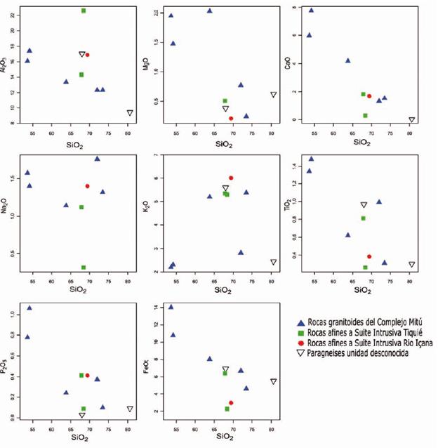 Generalmente se acepta que la Provincia Geocronológica Río Negro - Juruena o la Provincia Río Negro (Santos et al., 2000; Tassinari y Macambira, 1999; Teixeira et al., 1989), a la cual pertenece el Complejo (Migmatítico de) Mitú, se haya formado principalmente por granitoides provenientes de magmas juveniles desde 1,8 hasta 1,4 Ga (Tassinari y Macambira, 1999). Sus relaciones iniciales 87Sr/86Sr entre 0,702 y 0,706, valores li1 alrededor de 8,0, y mayoritariamente valores positivos de ɛNd relativo a CHUR (+4 a -2), calculados para 1,8 Ga, sugieren un origen juvenil derivado del manto para la mayor parte de estas rocas del basamento (Tassinari et al., 1996). Sin embargo, el estudio de granitos del Bajo Vaupés de la misma provincia y la ocurrencia frecuente de rocas néisicas llevaron a Dall'Agnol (1992) a plantear la hipótesis que los granitoides del Bajo Vaupés se hayan formados a partir de rocas de corteza continental, o si se derivaron de una fuente mantélica, fueron afectados fuertemente por contaminación cortical. Esta interpretación coincide con nuestras observaciones de los granitoides del Complejo Mitú estudiados en el sur del Departamento de Guainía que geoquímicamente corresponden a granitos calcoalcalinos y per a metaluminosos, con circones heredados más antiguos (1900 Ma) y características sin-colisiónales a pos-orogénicos; lo que indica o un retrabajamiento de rocas preexistentes o contaminación cortical del magma. Igualmente, Cordani et al. (2016) concluyen de las relaciones isotópicas Sr y Sm/Nd una afinidad cortical de los granitoides de esta zona, mientras Mendoza (2012) asumió que el complejo es totalmente alóctono conformado inicialmente por rocas pertenecientes al Complejo Granítico Supamo (>1,8 Ga) que fueron afectadas por la Orogenia Transamazónica y los eventos Parguazensis y Nickeriano.