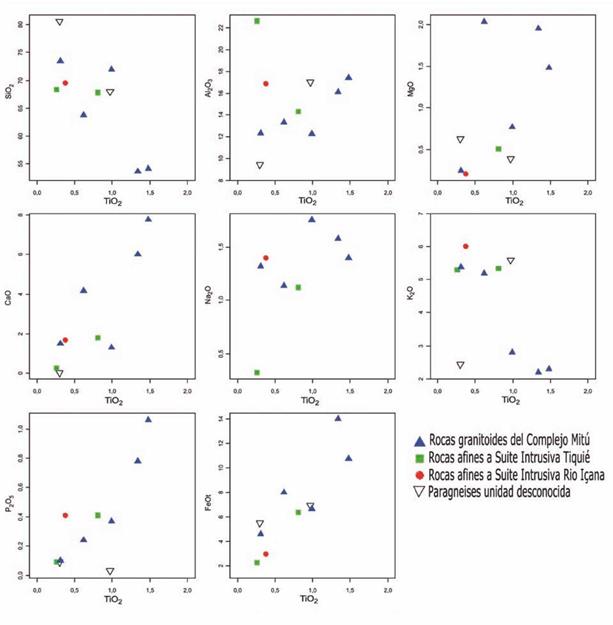 Las observaciones de campo y características petrográficas y geoquímicas confirman para la mayoría de los gneises, granitoides y pegmatitas del área de estudio su pertenencia al Complejo Mitú que en Brasil es descrito como Complejo Cumati. Otras rocas ígneas coinciden más con las Suites Intrusivas Rio Içana y Tiquié, unidades descritas en Brasil a una distancia menor de 14 km del área de estudio. Un tercer grupo de cuarcitas, meta-arenitas y paragneises fueron identificados inicialmente como pertenecientes al Grupo Tunuí. En este subcapítulo nos detenemos en las características petrográficas de las rocas ígneas, mientras las observaciones de campo, petrografía y resultados e interpretaciones geoquímicas de las diferentes unidades encontradas en el área de estudio se detallan en los subcapítulos correspondientes. Su correlación geocronológica se realiza más adelante.