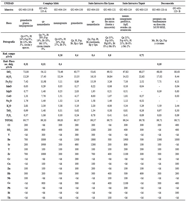 De los 25 afloramientos visitados y muestreados se escogieron para esta investigación las rocas más representativas de cada unidad litoestratigráfica aflorante en el Río Cuiarí y la parte alta de Caño Naquén, con poca alteración visible, aptas para análisis petrológico, geoquímico y geocronológico. Las secciones delgadas fueron analizadas en un microscopio petrográfico Zeiss Axio Scope A1. La clasificación petrográfica modal de rocas ígneas se efectuó a partir de conteo por 300 puntos, según las recomendaciones de la IUGS (Gillespie y Styles, 1999; Maitre et al., 2002; Streckeisen, 1978). Para determinar los elementos mayores, menores y traza (TABLA 1), 10 muestras (de las cuales 8 fueron usadas también para geocronología, TABLA 2) fueron pulverizadas, mezcladas y prensadas con cera espectrométrica Merck en relación muestra:cera de 10:1 y analizadas con un equipo de fluorescencia de rayos X, Phillips MagixPro PW - 2440, en la Universidad Nacional de Colombia, Sede Bogotá (tubo de rodio, potencia máxima de 4 kW, límite de detección de elementos pesados metálicos 20 ppm). Los datos geoquímicos fueron procesados en una tabla Excel y el software libre GCDkit5.0 (Janousek et al., 2006). Donde se compararon los resultados petrográficos-geoquímicos con datos obtenidos en granitoídes del Complejo Mitú por Bruneton et al. (1983) y la amplia base de datos geoquímicos mundial de EarthChem.org (www.earthchemportal.org).