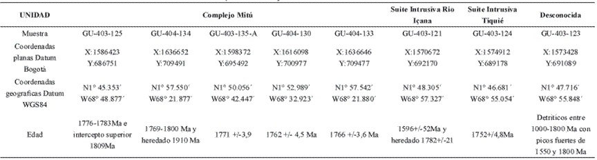 Los datos analíticos U-Pb medidos en circones mediante LA-ICP-MS permiten distinguir cuatro grupos de edades para las rocas identificadas en el área de estudio: a) un grupo relacionado con el metamorfismo de ortogneises y la cristalización de granitoides del Complejo Mitú; b) otro más joven relacionado con la cristalización de un cuerpo ígneo correlacionable con la Suite Intrusiva de Tiquié en Brasil, c) un tercer grupo al parecer relacionado con la cristalización de un cuerpo ígneo correlacionable con la Suite Intrusiva de Içana y con circones heredados de rocas del Complejo Mitú, y d) una mezcla de edades derivadas de circones detríticos encontrados en un paragneis sin relación geocronológica con el Grupo Tunuí.
