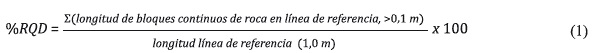 donde el numerador es la suma de las separaciones mayores a 0,1 m (10 cm) entre discontinuidades que intersectan una línea horizontal de referencia en el afloramiento. En la ecuación 1 debe tenerse presente que, si la longitud de la línea de referencia cambia, también debe actualizarse la condición del numerador para mantener las proporciones. Por ejemplo, si la longitud de línea de referencia es 10 m, entonces la condición del numerador ahora es "> 1 m" (100 cm).