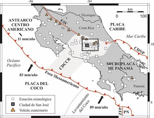 La zona central de Costa Rica se caracteriza por una alta densidad de fallas activas (Montero, 1994, 2001; Marshall et al., 2000). En esta zona, también se localiza la ciudad capital San José y la Gran Área Metropolitana (GAM). Costa Rica se localiza al sur del istmo centroamericano en una zona donde interactúan las placas del Coco, Caribe y Nazca y la microplaca de Panamá (FIGURA 1). La parte central de Costa Rica es atravesada por el Cinturón Deformado del Centro de Costa Rica (CDCCR), el cual ha sido interpretado como el límite entre la placa Caribe y la microplaca de Panamá (e.g.Marshall et al., 2000; Montero, 2001). El CDCCR incluye en una zona de ~100 km de ancho, fallas y pliegues neotectónicos de diversa geometría que transfieren desplazamientos entre los bloques tectónicos de la zona (Montero, 1994, 2001; Marshall et al., 2000). El origen del CDCCR puede estar asociado con la colisión del levantamiento del Coco con el sureste de Costa Rica y la subducción de corteza oceánica engrosada, los cuales provocan el desplazamiento de la microplaca de Panamá con respecto de la placa Caribe (Marshall et al., 2000; Montero, 2001). Desde 1900, el CDCCR ha sido la fuente de 20 sismos destructivos incluyendo el que devastó la ciudad de Cartago en 1910 (6,1 Ms) que con un saldo de 300 víctimas, constituye el peor desastre de la historia de Costa Rica (Montero y Miyamura, 1981; Montero, 2010; Peraldo y Montero, 2010; Alonso-Henar et al., 2013; FIGURA 2).