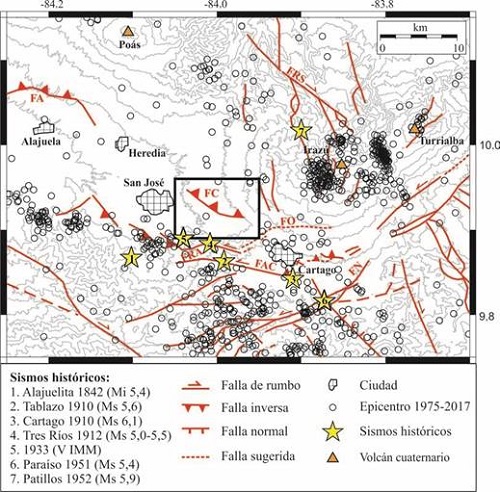 Los sismos históricos más importantes con epicentro en la vecindad de la falla Cipreses (i.e., Rojas, 1993; Montero y Alvarado, 1995; Ambraseys y Adams, 2001; Fernández y Montero 2002; Montero et al., 2005, Montero et al. 2016; FIGURA 2 ) son los terremotos de Alajuelita del 21 de marzo de 1842 (con una magnitud Mi estimada con base en observaciones de intensidad de 5,4), Tablazo del 13 de abril de 1910 (Ms 5,6), Cartago del 4 de mayo de 1910 (Ms 6,1), Tres Ríos del 21 de febrero de 1912 (Ms 5,0-5,5), sureste de San José del 12 de julio de 1933 (Intensidad Mercalli Modificada IMM máxima de V), Paraíso del 22 de agosto de 1951 (Ms 5,4) y Patillos del 30 de diciembre de 1952 (Ms 5,9).