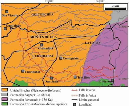 Geológicamente en la zona de la falla Cipreses se reconocen principalmente unidades de origen volcánico con edades que van desde el Pleistoceno hasta el Holoceno (Denyer y Arias, 1991; FIGURA 3) y en menor medida rocas sedimentarias del Mioceno Medio-Superior, como la Formación Coris (Fischer y Franco, 1979; FIGURA 3). La cobertura volcánica ha sido subdividida en varias formaciones llamadas: Reventado y Sapper y la Unidad Brechas (FIGURA 3). De acuerdo con Krushensky (1972), la Formación Reventado incluye tres miembros denominados Paraíso, Manto de Ceniza Roja y Superior, los cuales poseen las siguientes litologías: lava augítica (Miembro Paraíso), ceniza meteorizada (Miembro Manto de Ceniza Roja) y además coladas de lava andesíticas, depósitos de lahares y cenizas meteorizadas (Miembro Superior), con una edad de 136±5 ka (Alvarado et al., 2006). La Formación Sapper incluye tefras, coladas de lava y diques (Krushensky, 1972) con edades de entre 68 y 36 ka (Allègre y Condomines, 1976). Finalmente, la Unidad Brechas, compuesta por los depósitos del Pleistoceno-Holoceno de los volcanes ubicados en la Cordillera Volcánica Central, incluye avalanchas de lodo y la cobertura de tobas y cenizas (Denyer y Arias, 1991), así como depósitos descritos como avalanchas de detritos (Alvarado et al., 2004; Hidalgo et al., 2004). Esta unidad se observa aflorando en casi todos los ríos y quebradas en los alrededores de la falla Cipreses, con litologías como brechas sobreyacidas por tobas (FIGURA 3).