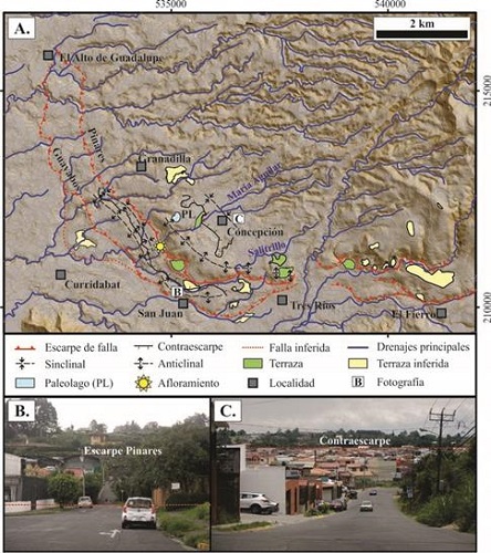 ABSTRACT: The Cipreses fault is located in the central part of Costa Rica, in the most populated region of the country. In this paper, the Cipreses fault is analyzed based on geomorphological, geological, and seismological observations.The main geomorphological evidences found are: scarps, terraces, river incisions, and deflected and dammed streams. In the vicinity of the fault, there are three main Pleistocene geologic units: tuff, breccia, and andesitic lavas. These units were found displaced by the fault in an outcrop. From the seismological analysis, we conclude that the instrumental seismicity is low, but at least one earthquake in 2010 (4.1 Mw) was originated in the Cipreses fault. The focal mechanism solution for this event indicates a thrust fault with a nodal plane of dip direction N30°E/35° in agreement with the fault plane found in the field and the geomorphological observations. Based on a conceptual model for the faulting, we interpret that the Cipreses fault corresponds to a master fault that propagates to the surface along two fault segments named Pinares and Guayabos. The displacements of these faults made two anticlinal folds, which are expressed at the surface as prominent scarps. Based on the evidences found we conclude that the Cipreses fault is an active thrust fault with a surface expression of 14 km and with the seismic potential of magnitude Mw 5.9-6.5.