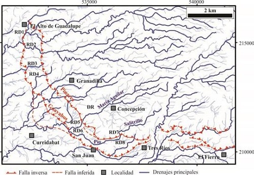 Además, existen drenajes que son desviados (RD), por ejemplo los rotulados como RD1, RD2, RD3 y RD4 (FIGURA 5) presentan desvíos en las proximidades de los escarpes Guayabos y Pinares. En particular, en algunos drenajes se presentan goteras tectónicas, es decir, un patrón de drenaje en el cual el río discurre paralelo al escarpe, similar al identificado y asociado con fallas inversas en Colombia y Venezuela (e.g.Audemard, 1999, 2003; Ollarves et al., 2006). Por ejemplo, el río señalado con RD5 (FIGURA 5), que inicia al oeste de Concepción discurre hacia el oeste, pero conforme transcurre a través del escarpe Pinares cambia a un rumbo sureste discurriendo paralelo a dicho escarpe. Aguas abajo, RD5 se curva hacia el este cuando se encuentra con el escarpe Guayabos en donde además el valle se profundiza.