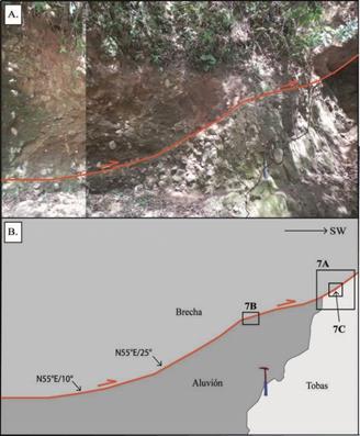 La falla observada en este afloramiento sobrecorre las brechas sobre los depósitos aluviales y las tobas (FIGURAS 6 y 7 ). Los depósitos aluviales se observan acuñados dentro de las tobas (FIGURA 6B). En el sector suroeste del afloramiento, las brechas sobreyacen a las tobas con un claro contacto de falla (FIGURA 7A).