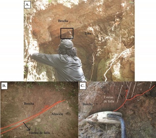 También se reconocieron estrías de falla observadas en el bloque del techo en el sector donde la brecha está en contacto con la toba (FIGURA 7C). Allí se midió un ángulo de rake de 85°, el cual es concordante con el de una falla con muy alta componente de movimiento inverso. La falla encontrada en este afloramiento es denominada en este estudio como falla Pinares.