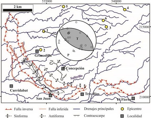 La solución a 3 km de profundidad fue considerada como la mejor por mostrar el menor RMS (0,36 s) (FIGURA 8). Los errores en la localización del sismo fueron de 1,2, 1,6 y 1,8 km en latitud, longitud y profundidad, respectivamente. Tomando en cuenta estas incertidumbres en la localización del hipocentro y el plano nodal que es consistente con la dirección de buzamiento de la falla Cipreses (N30°E/35° y ángulo de rake de 90°, (TABLA 2), el hipocentro del sismo del 5 de marzo del 2010 podría coincidir con la ubicación de la falla en profundidad. Un cálculo trigonométrico sencillo usando la profundidad del hipocentro con sus incertidumbres y el ángulo de buzamiento del plano nodal de interés, sugiere que la traza superficial de la falla se encontraría entre 0,8 y 3,4 km del epicentro. Esto concuerda con la distancia obtenida de 2,5 km entre el epicentro y la traza en donde la expresión superficial posee una dirección de buzamiento similar al del plano nodal (N30°E) al sur de Granadilla (FIGURA 8). La solución de este plano nodal, es además concordante con el plano de falla de dirección de buzamiento N55°E/25° y ángulo de rake de 85° observado en el afloramiento descrito en la sección anterior. Por esta razón, se considera que el origen de este sismo podría ser atribuido a la falla Cipreses.