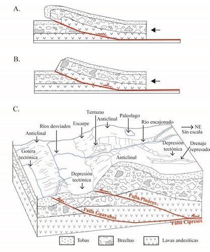 En el modelo propuesto, la falla Cipreses corresponde con una falla maestra que se propaga hacia la superficie a lo largo de dos ramales denominados Pinares y Guayabos, los cuales son paralelos entre sí (FIGURA 9C). La propagación de dichas fallas sería la que generó las geomorfologías descritas en la sección anterior como escarpes de flexura, contraescarpes, terrazas, gotera tectónica y ríos encajonados, desviados y represados (FIGURAS 4A, 9C). Todos estos elementos son similares a los incluidos en modelos presentados por Suppe y Medwedeff (1990), Keller y Pinter (2002), (Audemard 1999, Audemard, 2003) y Ollarves et al. (2006) para fallas inversas.