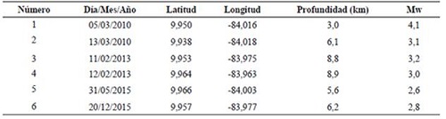 El sismo de mayor magnitud (Mw 4,1) sucedió el 5 marzo del 2010 (número 1 en TABLA 1). Este evento fue percibido con una IMM de V en la zona del epicentro y de forma leve en ciudades más distantes como Alajuela, Heredia y Cartago (RSN, 2010; FIGURA 2). El 13 de marzo del 2010 ocurrió una réplica de Mw 3,1 (número 2 en TABLA 1) que también fue percibida en la zona epicentral (RSN, 2010). Estos dos sismos del 2010 son los más cercanos a los escarpes Pinares y Guayabos (FIGURA 8).