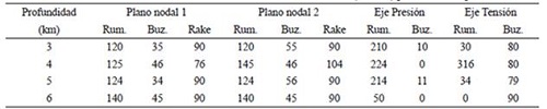 De los seis sismos relocalizados solamente se logró calcular un mecanismo focal de buena calidad para el evento del 5 de marzo del 2010. La localización y cálculo del mecanismo focal se realizó a partir de la lectura de 47 arribos de la onda P, 27 polaridades claras y un GAP de 58°. La estabilidad de la solución fue explorada para profundidades de entre 3 y 6 km (TABLA 2) en las cuales se tenían los menores residuos en la localización. En todos los casos, las soluciones corresponden con una falla inversa cuyos planos nodales tienen un rumbo noroeste-sureste, un ángulo de inclinación de entre 34 y 56° y un ángulo de rake de entre 76 y 90° (TABLA 2). Para todas las profundidades, uno de los planos nodales se inclina hacia el noreste (plano nodal 1, TABLA 2). Este plano nodal es consistente con la falla Cipreses.