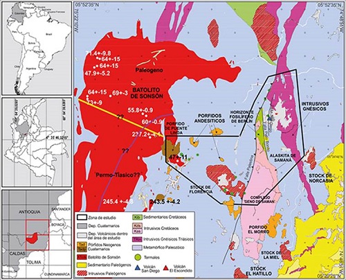 De gran interés resulta la edad registrada para el Batolito de Sonsón, pues los antecedentes reportan dos edades tanto Paleógenos como Triásicas. Esta edad abre la discusión respecto a las otras dataciones registradas en otras partes del Batolito y por diferentes autores. Por un lado (González 1980), (González 2002) mediante K-Ar en roca total registró valores de 170±10 Ma y 160±4 Ma. (Pérez 1967) mediante K/Ar reporta una edad de 69,3±3 Ma, (Ordoñez et al. 2001) reporta edad de cristalización de 60,7±1,4 Ma mediante SHRIMP U-Pb en zircones y (Leal-Mejía 2011) mediante el método U-Pb en circones con LA-MC-ICP-MS reporta una edad de 58,6±0,9 Ma para una granodiorita, facie principal del Batolito y 55,8±0,9 Ma y 60,0±0,09 Ma para dos leucogranitos, todas estas dataciones realizadas al norte del Batolito. Tanto (Ordoñez et al. 2001) como (Leal-Mejía 2011), soportan la idea de una edad Paleógena para la parte norte del batolito que difiere química e isotópicamente de la parte sur de esta misma intrusión línea amarilla y morada en (FIGURA 1). Esta nueva fecha pondría al Batolito de Sonsón al menos es su parte central y más oriental en el Paleoceno y no en el Jurásico, lo que reflejaría claramente que se trata de un cuerpo diferente al denotado como Batolito de Sonsón.