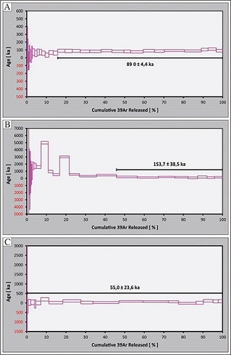 Tres muestras fueron datadas mediante Ar-Ar en los laboratorios de la universidad del Estado de Oregon, USA. La técnica se hizo con un espectrómetro de masas ARGUS-VI usando el método de calentamiento gradual. Para el caso de las muestras de este trabajo, donde las rocas tenían una edad tentativa menor a 2 Ma, se hizo una irradiación de 0,5 horas en el reactor TRIGA CLICIT de la Universidad del Estado de Oregon.