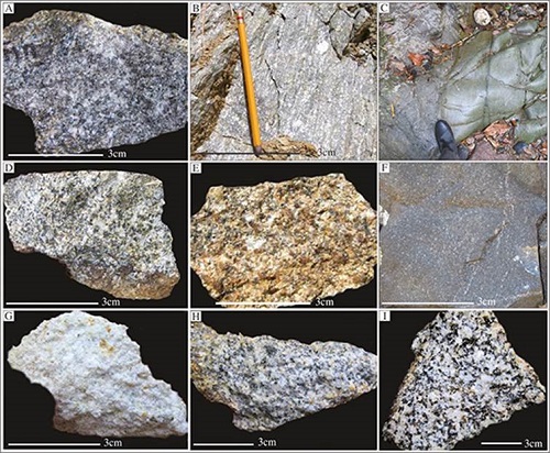 Cuatro cuerpos plutónicos hacen parte de la geología del área de estudio, entre los que están el Complejo Ígneo de Samaná (Kds) y la Alaskita de Samaná (Kas) que aunque son mapeadas por separado, es común encontrar afloramientos leucocráticos dentro del Complejo Ígneo de Samaná; el complejo ígneo presenta diferentes litologías, predominan granodioritas, monzogranitos y en menor proporción cuerpos básicos a manera de pequeños diques (FIGURA 2C, 2D, 2E y 2F). Esta litología es vista solo en el área de trabajo, pero registros como en (Loaiza 2012) referencia que al menos el 60% del cuerpo es de litología diorítica-gabroica.