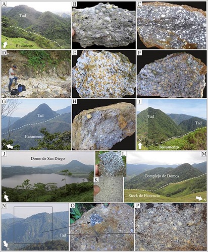 Dentro de este grupo Tad es catalogado según (Feininger et al. 1972) el cuerpo dómico del Maar de San Diego el cual no es claramente hornblendítico sino más bien biotítico con un carácter más dacítico (FIGURA 3J y 3K). Igualmente el complejo de domos del volcán El Escondido de Florencia presenta un aspecto muy similar a los demás cuerpo porfiríticos pero estos son claramente más recientes y correspondería a la actividad intracaldérica del volcán (Monsalve, 2015); (Monsalve et al., 2017) (FIGURA 3L y 3M).