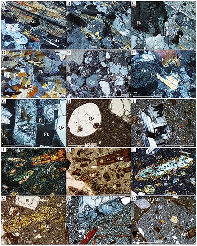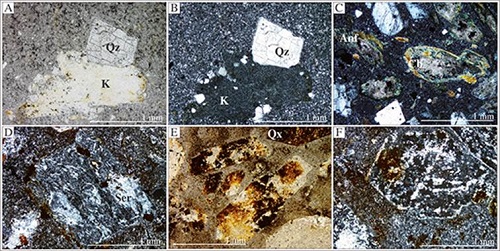 Los cuerpos subvolcánicos son de composición andesítica y dacítica. Las andesitas tienen fenocristales (>2 mm) y microfenocristales (2-0,5 mm) de plagioclasas (predominio de albita y labradorita mediante análisis por DRX) microfenocristales de anfíboles hexagonales y cuarzo bipiramidal; la matriz varía de microcristalina a criptocristalina, con microcristales de anfíbol, con porcentajes entre 50 y 90%, en algunas rocas la matriz vítrea predomina sobre la cristalina (FIGURA 4J y 4K). Las dacitas tienen microfenocristales de cuarzo bipiramidal (FIGURA 4H) entre 6 y 10%, en menor proporción de plagioclasa entre 4 y 7% y hornblenda puede estar presente. La matriz de estos cuerpos varía de 51% a 80% y comúnmente se muestra alterada.