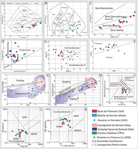 En la unidad Complejo Ígneo de Samaná los valores de SiO2 van de 68,15 a 74,18 %wt para las muestras más acidas y el Al2O3 va de 14,02 a 18,14. Los contenidos de Na2O y K2O están en el rango de 3,38 y 4,16 y entre 3,4 y 0,75 respectivamente y el Ti2O tiene cantidades de 0,34 a 1,98. Los valores de las muestras básicas muestran una variación importante en SiO2 con 53,13 %wt y en Na2O y K2O, con 4,1 y 0,74 %wt respectivamente. El Ti2O se presenta con 2,94 %wt muy por encima que los valores de la roca caja (rocas acidas) al igual que el Fe2O3 con 13,721 %wt. La clasificación TAS ubica las rocas del complejo ígneo en el campo de los gabros hasta los granitos, pasando por dioritas y cuarzodiorita (FIGURA 6A y 6B).
