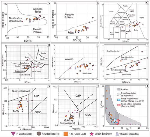 Según el diagrama de (Peccerillo y Tylor 1976) la mayoría de las muestras caen en el campo de rocas de serie subalcalina (FIGURA 7E), calcoalcalina con cuatro muestras en el campo de la serie calcoalcalina alta en potasio (FIGURA 7F). Por último, todas las muestras caen en el campo de los granitoides de arco volcánico según el comportamiento de Rb vs Y+Nb y Nb vs Y (FIGURA 7G y 7H). Para las rocas porfiríticas volcánicas y subvolcánicas se graficó el diagrama de clasificación de rocas adakiticas (FIGURA 7I), donde se evidencia que todos los cuerpos dómicos (domos de los volcanes San Diego y El Escondido), los cuerpos denotados como porfiríticos andesíticos y el pórfido de Puente Linda se ubican en el campo de las adakitas.