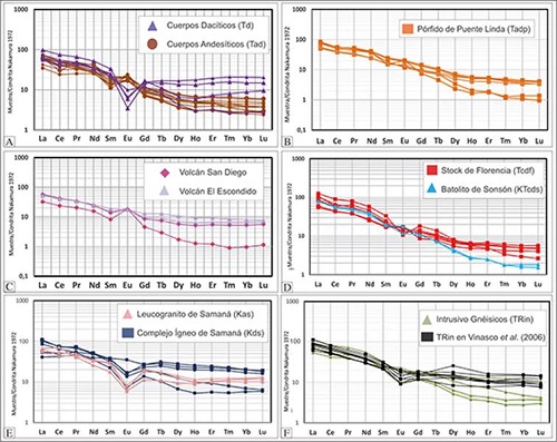 Las cuatro muestras de los cuerpos volcánicos (FIGURA 8C) reflejan el mismo patrón de REE con ligeras variaciones en las cantidades muy seguramente debido al grado de diferenciación. Una de las muestras refleja un comportamiento anómalo especialmente en las HREE aunque muestra la misma tendencia. Todas muestran una anomalía ligeramente positiva de EuN/√(SmN*GdN) 1,45 a 4,76 para San Diego y de 1,65 a 1,11 para El Escondido.