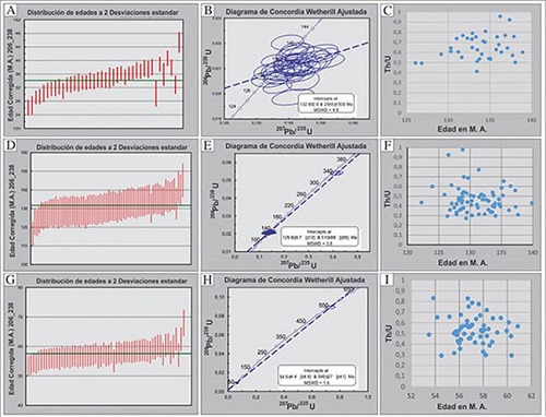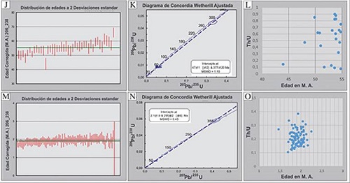 El Stock de Florencia se dató en circones con zonaciones sectorizadas y concéntricas y con relaciones Th/U típicas de circones de origen ígneo entre 0,3 y 0,8 (FIGURA 9I). Se reportó una edad de 54,6±4,4 Ma (FIGURA 9H), como resultado de la ablación de 64 puntos en igual número de cristales (FIGURA 9G), así como edades heredadas desde 150 hasta 500 Ma. Para el Batolito de Sonsón se realizaron 45 ablaciones en igual número de circones (FIGURA 9J), de ese total nueve mostraron edades de entre 115 y 290 Ma. La mayoría de los circones mostró una zonación sectorizada y unos pocos una zonación concéntrica o muy débilmente zonada con morfología de circones alargada y cuya relación de Th/U fue bastante dispersa (FIGURA 9L). Se reportó una edad de 47±11 Ma como edad mínima de cristalización (FIGURA 9K).