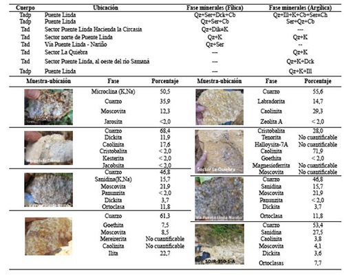 Cloritización y Seritización (débil): Reconocida por una evidente cloritización de micas y algunos anfíboles, mientras que la sericita ataca a los feldespatos sódicocálcicos y potásicos. Se presenta en los grandes intrusivos, especialmente en la unidad gnéisica. Los resultados de DRX reporta la facie moscovita que haría referencia tanto a la moscovita primaria que es evidente en sección delgada como a sericita, que es igualmente reconocible bajo el microscopio. Igualmente, la fase clinocloro es reconocida por DRX, el cual se trata de un mineral del grupo de las cloritas. Fílica (Sericítica): Afecta ligeramente a los grandes intrusivos (TRin, KTcds, Kds y Kas) reemplazando la plagioclasa por sericita y micas por cloritas, en ocasiones en sus núcleos o remplazándola totalmente como es el caso del intrusivo gnéisico. Se da mayormente en los cuerpos andesíticos en el sector de Puente Linda y en el propio pórfido de Puente Linda, donde altera los fenocristales y la matriz. Argílica: Representada por caolinita (K) y cuarzo (Qz) en los cuerpos porfiríticos y acompañada de sericita y dickita (Dck) reemplazando mayormente plagioclasa, también se presentan carbonatos (Cb) remplazando mayormente anfíboles y plagioclasa. Se expone en la mayoría de los cuerpos andesíticos y en el de Puente Linda, exceptuando el cuerpo al sur del área de estudio, el cual se muestra mucho menos alterado que los demás.
