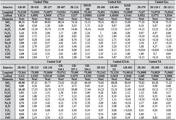 La caracterización de los elementos mayores se hizo mediante fluorescencia de rayos X (FRX) a 38 muestras con un equipo PANalytical AXIOS Minerals, para esto fueron pesados 10g de muestra a la que posteriormente se le agregó un aglomerante, se homogenizó y se llevó al equipo prensador para formar la pastilla que posteriormente es analizada. Los resultados reportados se expresan en %wt para cada uno de los elementos mayores (SiO2, Al2O3, Na2O, K2O, P2O5, CaO, MgO, TiO2, Fe2O3, y FeO) incluyendo el LOI, exceptuando el manganeso que es presentado en ppm.