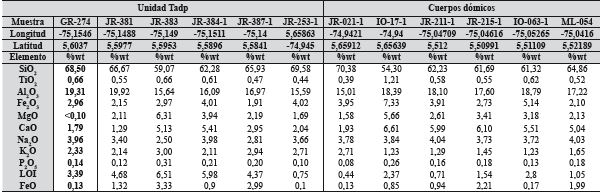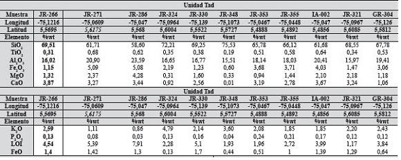 Los valores de la química de los cuerpos dacíticos (Td) como se esperaría para cuerpos tan ácidos, muestra concentraciones de SiO2 que sobrepasan el 75 %wt para tres de las muestras (79,82 a 84,28 %wt) y solo una registra un valor menor de 71,32 % wt. El contenido de Al2O3 está entre el 10 y 17 % wt, para Na2O y el K2O los valores no son mayores al 4 y 3,7 % wt respectivamente. El CaO en todas las muestras da por debajo del límite de detección. Según clasificación TAS las muestras de los cuerpos porfiríticos dacíticos por su alto contenido de SiO2 se salen del área del diagrama.