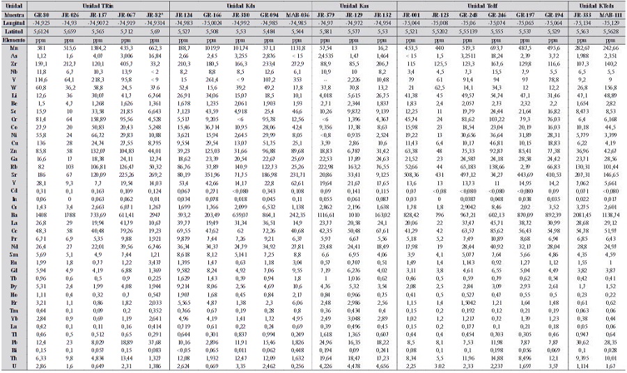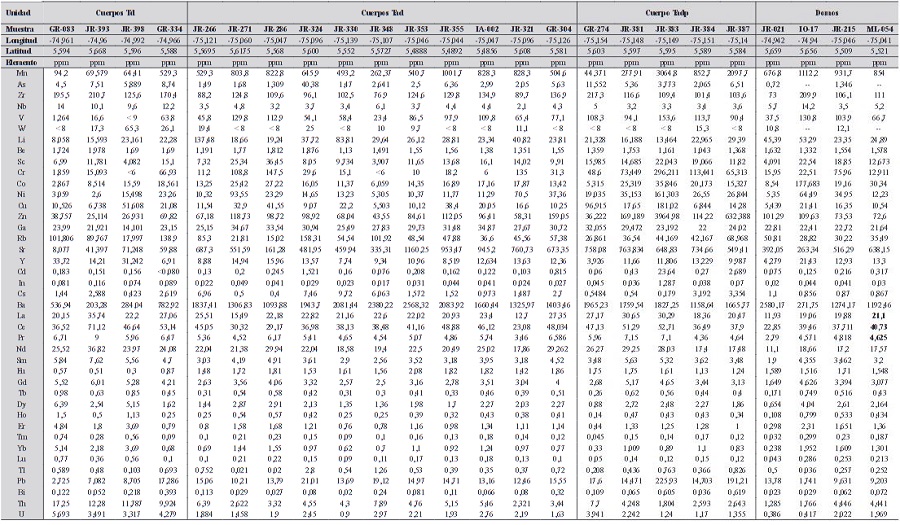 Para conocer la química de los elementos, menores y traza se empleó la técnica ICP-MS (Inductively Coupled Plasma-MassSpectrometry) la cual se hizo con un Espectrómetro de Masas con Plasma de Acoplamiento Inductivo con celda de colisión KED, Marca Perkin Elmer REF. NexION 300D. Para el análisis fueron separados 0,1g de muestra haciendo la digestión con ácido clorhídrico, nítrico y perclórico para posteriormente llevar a volumen de 10 ml con solución de ácido nítrico diluido al 3% v/v. Los resultados son presentados en ppm.