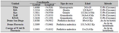 Todas estas unidades cortan la secuencia metamórfica (complejo Cajamarca) cuya edad de metamorfismo sería anterior al Triásico (Vinasco et al., 2006), por lo que algunos de los circones heredados en las muestras datadas podrían provenir de dicha unidad y/o de núcleos más antiguos.