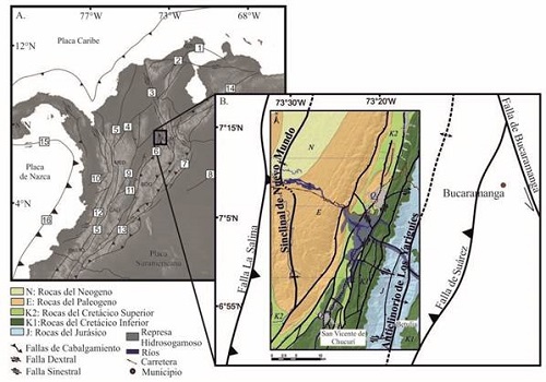 La evolución geológica de los Andes colombianos está relacionada con la interacción de las placas de Nazca, Caribe y Suramericana. Los campos de esfuerzos inducidos por el movimiento de estas placas han generado una intensa deformación, que para la zona de estudio es evidenciada por fallas de cabalgamiento y de rumbo de carácter regional como La Salina, Suárez y Bucaramanga (Figura 1), principales estructuras que dominan la geología del área, además del SNM y el AY.
