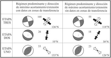 Esta primera etapa representa una fase distensiva - transtensiva y fue identificada por los planos de falla que al rotarse a una estratificación de 0° a 10° revelaron una población de fallas normales y algunas de rumbo. Las formaciones Rosablanca y La Luna son las que mejor reflejan esta etapa, con una importante componente transtensiva registrada en las rocas del Cretácico Tardío (Figura 9), según la ubicación estratigráfica de los datos procesados. En estas dos unidades se observa una extensión NW-SE que está definida en las fallas longitudinales con rumbo NE que se muestran en los balones de playa (Figura 9) y en los trazos cartografiados (Figuras 2 y 6). Mientras tanto, en la Formación Tablazo la extensión ocurre en sentido N-S, pero relacionada con fallas transversales como la Falla El Tablazo, lo que se confirma al examinar la ubicación de los datos en zonas de transferencia (Figuras 6 y 9). Estas zonas están caracterizadas por fallas de rumbo y normales propias de ambientes distensivos en cuencas sedimentarias (McClay y Ellis, 1987). Para determinar la dirección de máxima extensión, asociada al tensor de esfuerzo principal menor (σ3), se procesaron por un lado la totalidad de los datos hallados en esta etapa y por otro los datos alejados de las zonas de transferencia, resultando direcciones de extensión en azimut de 133° y 126°, respectivamente (Figura 10). Estas direcciones se pueden generalizar a NW-SE, es decir, con un tensor de acortamiento SW-NE que significa un régimen transtensivo si se aplica en estructuras longitudinales sur-norte.