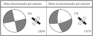 Los datos que a pesar de ser rotados no mostraron coherencia mecánica (cumplimiento de los principios de fracturación de Anderson, elipse de deformación y ángulo de pitch, Tabla 1) fueron eliminados, considerando además la calidad del dato registrado en campo. Lo anterior constituyó un primer filtro para los datos recolectados en campo.