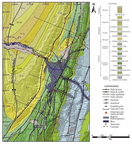 Al Grupo de Investigación en Geología Básica y Aplicada (GIGBA) de la Escuela de Geología (UIS). Los autores agradecen la colaboración de ISAGEN y del Smithsonian Tropical Research Institute, en especial a Carlos Jaramillo y Edwin Cadena, por facilitar el acceso a las obras del proyecto Hidrosogamoso. Agradecemos también las observaciones y comentarios de los profesores Gustavo Hincapié Jaramillo y José Fernando Duque Trujillo, los cuales permitieron hacer aclaraciones en el texto y mejorar el manuscrito.