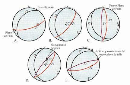 En este procedimiento, la estratificación fue rotada de manera gradual observando el cambio en la actitud y movimiento de los planos de falla hasta que se ajustaran a condiciones óptimas de generación, llevando la estratificación en varios casos a la horizontal (Tabla S2). En la Figura 3 se muestra un ejemplo de un dato de estría que fue rotado por no cumplir con las consideraciones asumidas. Este dato corresponde a un plano de falla de movimiento inverso con azimut de rumbo e inclinación 73/70 y pitch de 46°E encontrado en una unidad con estratificación de 215/36 (azimut de rumbo/inclinación). El plano de estratificación fue llevado a la horizontal, con un cambio en la actitud del plano de falla a 252/80, del pitch a 68°E y del sentido del movimiento del plano a una falla normal dextral. Detalles de la técnica de rotación implementada se puede encontrar en Babín y Gómez (2010) y Cetina y Patiño (2013).