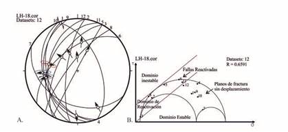 El procesamiento de los datos de estrías se realizó utilizando el software TectonicsFP (Reiter y Acs, 1996-2014), especializado en el manejo y procesamiento de datos estructurales. Con el objetivo de comprobar la superposición de eventos se generaron inicialmente gráficos de Angelier o proyección estereográfica de los planos y estrías de falla (Angelier, 1984) y Círculo de Mohr para los datos agrupados según su localización (por estaciones individuales o grupos de estaciones muy cercanas entre sí). El gráfico de Angelier fue empleado para mostrar la orientación de los planos de falla por estación (ejemplo estación LH18, Figura 4A) y el Circulo de Mohr para analizar la coherencia mecánica de los planos según su ubicación en el dominio inestable, de reactivación o estable (Martínez, 2002; Fossen, 2010; Burg, 2011; Figura 4B). Con base en estos gráficos se observó si los datos efectivamente correspondían o no a un mismo tensor de deformación (ejes de presión-tensión) y, a su vez, se usó como criterio para eliminar los datos del dominio estable, aplicando así un segundo filtro.